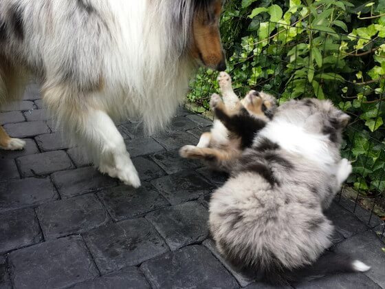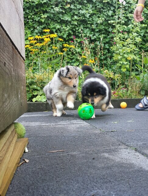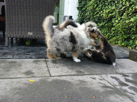 De pups vinden het heerlijk om lekker buiten te kunnen spelen. Ze kunnen lekker rond rennen, de tuin verkennen en met speeltjes spelen. Na het spelen is het dan weer heerlijk rustig en liggen ze uit te rusten onder de tuinstoelen.